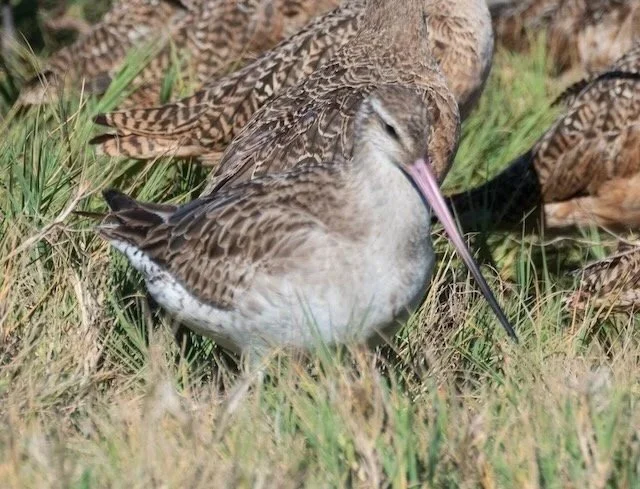 So in search of these fare (for Washington) birds, I drove 90 minutes, parked at the marina, chatted with a couple of other birders there chasing these Godwits, and then walked over to the dock. Along the rocks on the shore of the marina was a huge flock (300+) of godwits, and much to my amusement, less than ten feet from where I was standing, were the two Bar-tailed godwits, waving and offering autographs.