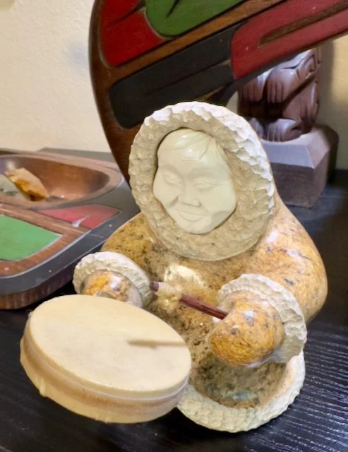 Until now. This is a beautiful drum dancer by an Alaskan native artist, Wendy Hook. My first piece from Alaska, a smaller piece at about 5” tall, carved out of soapstone, and I found it on Etsy and immediately fell in love with it. It’s the perfect size to sit behind my desk next to the Errol Ashley carved loon serving bowl. Her work is available through the Douglas Creek Sculpture company, and you can find it on Etsy.