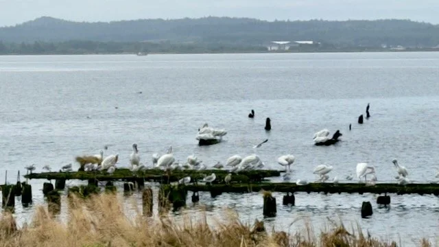 While exploring around Astoria, I spent time in Fort Stevens State Park, and a short visit to Cape Disappointment, where I found out much of the park is closed for construction, and I spent some time exploring and birding the Long Beach area, but the birding was slow and nothing much to talk about. My second day, since my legs were still grumping at me, I decided to take the drive up to Tokeland (about 90 minutes), where there has been a huge flock of Marbled Godwits hanging out in the Marina, and with them some local birding celebrities: two Bar-Tailed Godwits have been with the flock for weeks, as well as two Hudsonian Godwits.